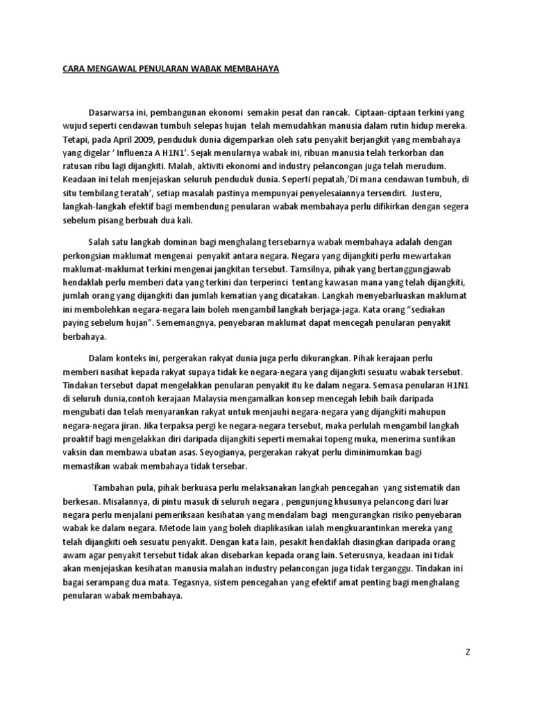 Karangan BM Bahasa Melayu SPM. Penyakit Influanza A H1N1 berlaku semenjak tahun lepas bermula dari 24 April 2009 yang telah diisytiharkan oleh Pertumbuhan Kesihatan Sedunia WHO sebagai krisis kecemasan kesihatan antarabangsa ekoran merebaknya wabak Virus. Punca penularan penyakit berjangkit.
